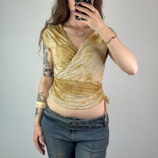 Y2K vintage tie dye ombre wrap style top ruched v neck short sleeve beige brown