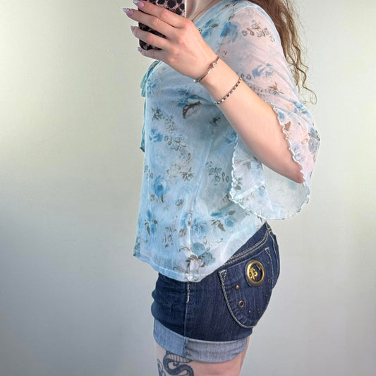 Y2K vintage mesh overlay floral 3/4 top flare sleeve bow v neck double layer