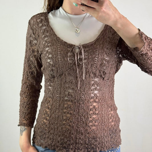 Y2K vintage mesh lace 3/4 sleeve top bust bow keyhole round deep neckline sheer