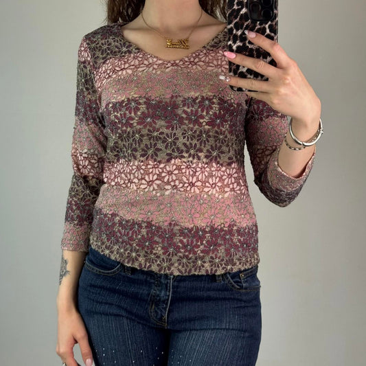 Y2K vintage mesh floral stripe 3/4 sleeve top lace pink/ purple v neck