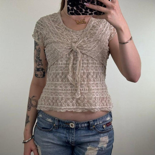 Y2K Vintage Mesh Lace Tie Front Cream Short Sleeve Top Stretchy Double Layer