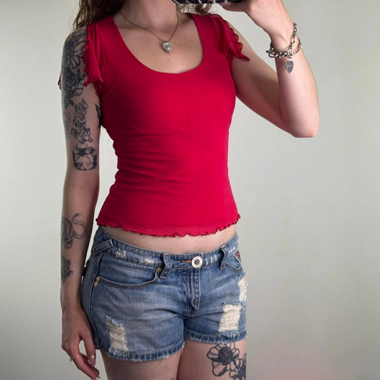 Y2K vintage mesh overlay lettuce hem frill sleeve top red round neck stretchy