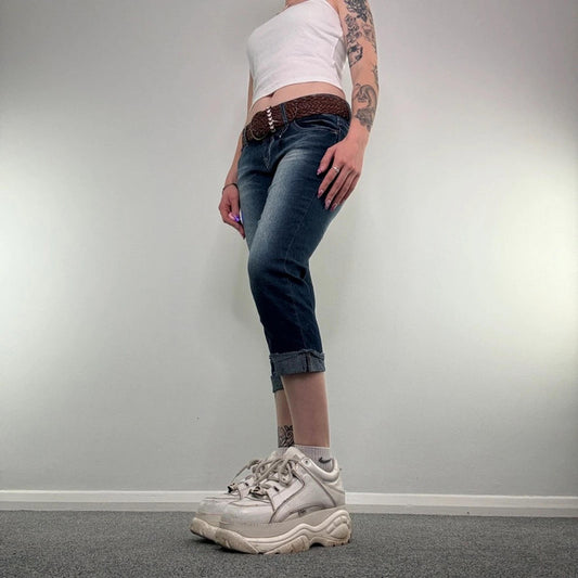 Y2K vintage mid rise stretch denim capri jeans with woven belt cropped faded