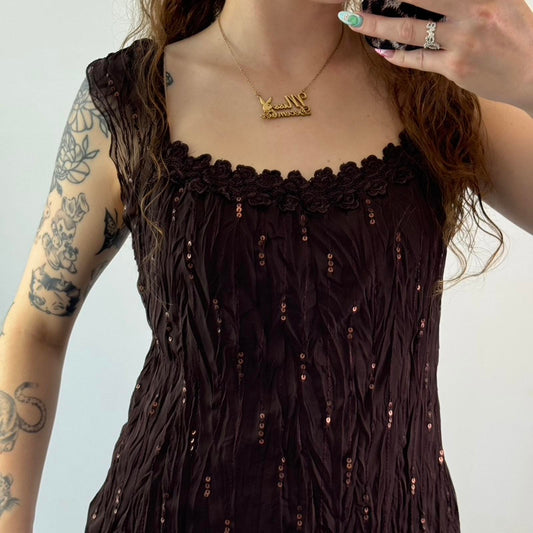 Y2K vintage crinkle sequin sheer cap sleeve top lace scoop neckline
