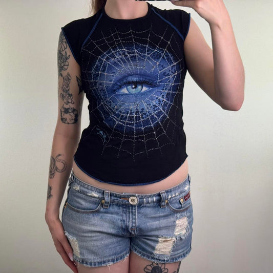 Y2K vintage cap sleeve graphic print t shirt baby tee spiderweb eye curved hem