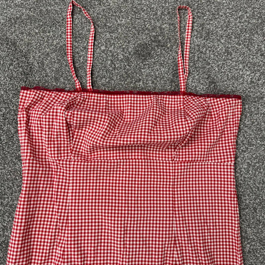 90s Y2K vintage gingham milkmaid midi dress frill bust trim red white stretchy
