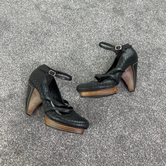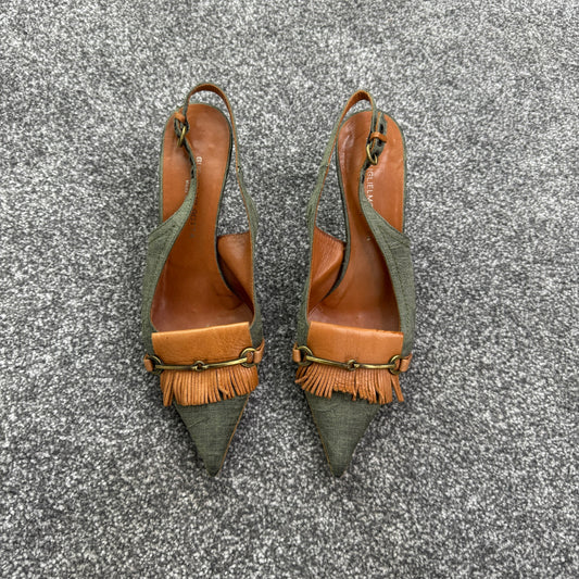 Y2K vintage denim kitten heels pointed leather fringe buckle snaffle bit archive