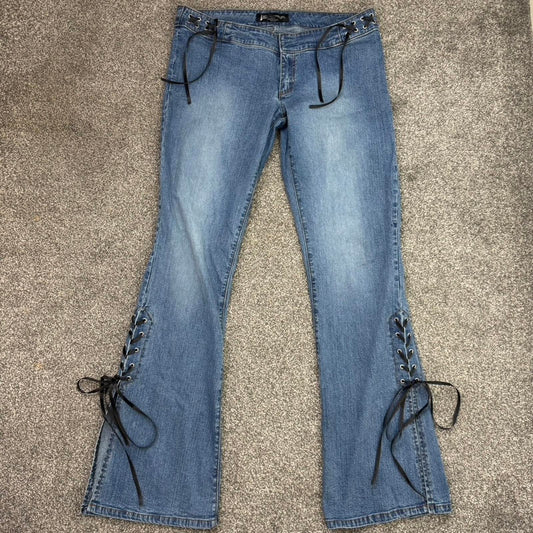 Y2K vintage JLO low rise flare lace up bootcut jeans stretchy faded denim bows