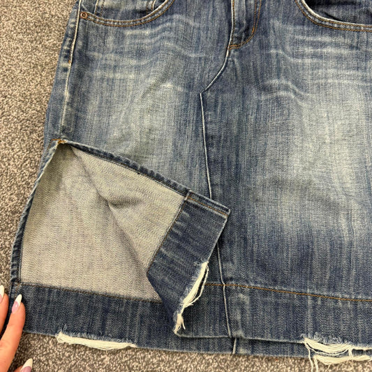 Y2K vintage denim midi skirt above knee length faded blue wash thigh slit