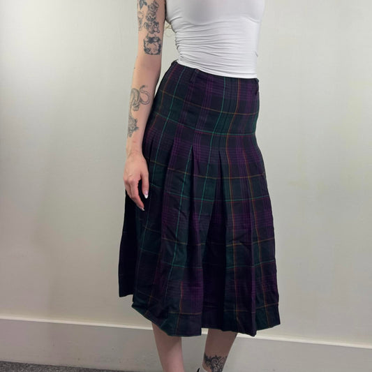 Y2K vintage tartan 100% pure wool maxi skirt a line pleated check green purple