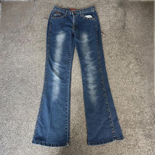Y2K vintage stretchy denim mid rise bootcut jeans faded lace up studded grommet