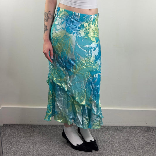 Y2K vintage silk blend floral ruffle maxi skirt stretchy waistband asymmetrical