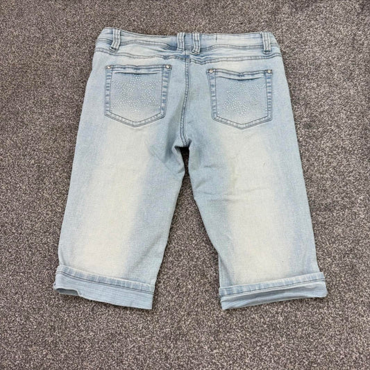 Y2K vintage low rise capri jeans light blue wash distressed cropped rhinestones