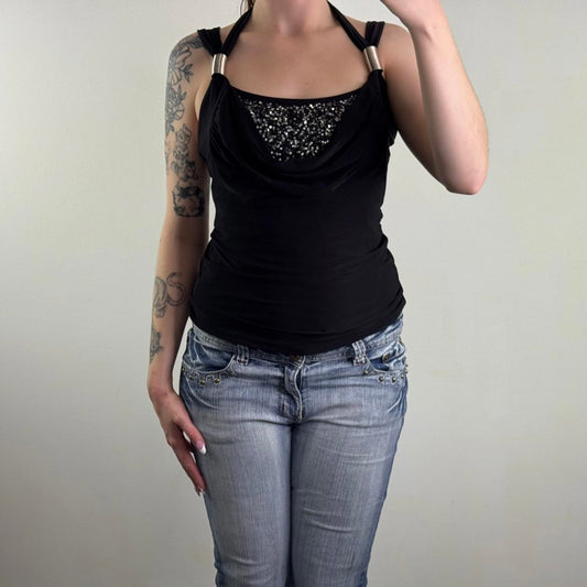 Y2K vintage slinky clubbing tank top stretchy cowl neck fitted ruched black