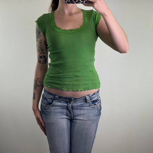 Y2K vintage cap short sleeve top lace trim fitted slight crop lettuce hem green