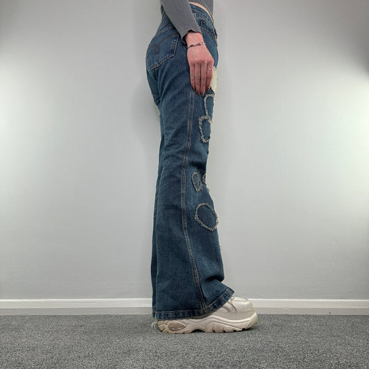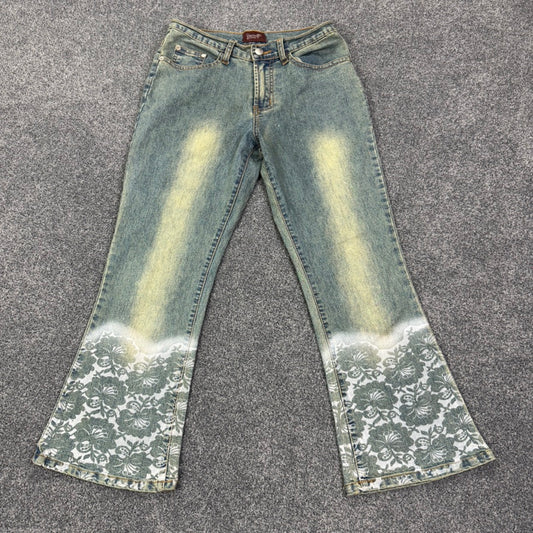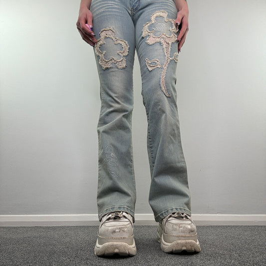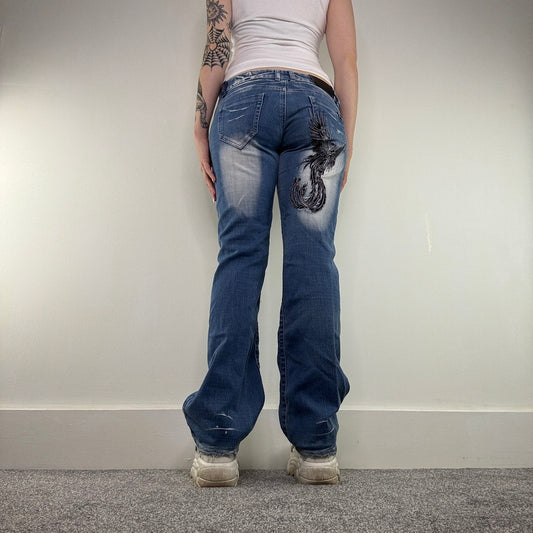 Y2K vintage low rise bootcut jeans faded denim phoenix embroidered mcbling