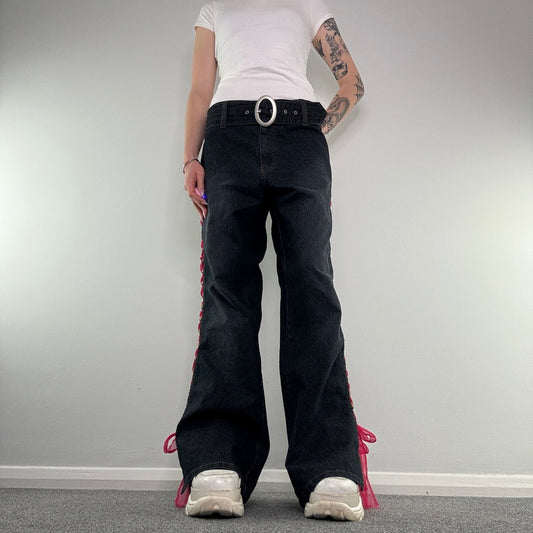 Y2K vintage stretchy lace up bow belt dark denim bootcut jeans