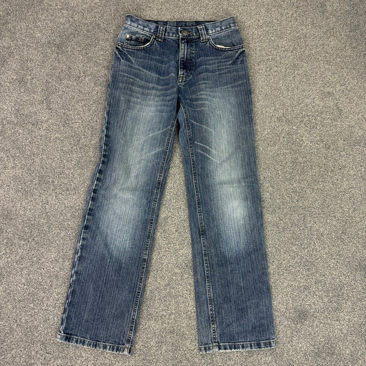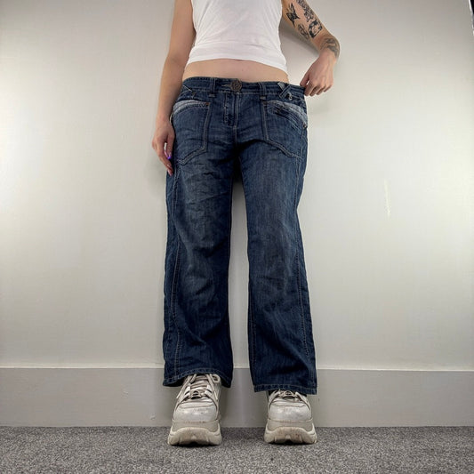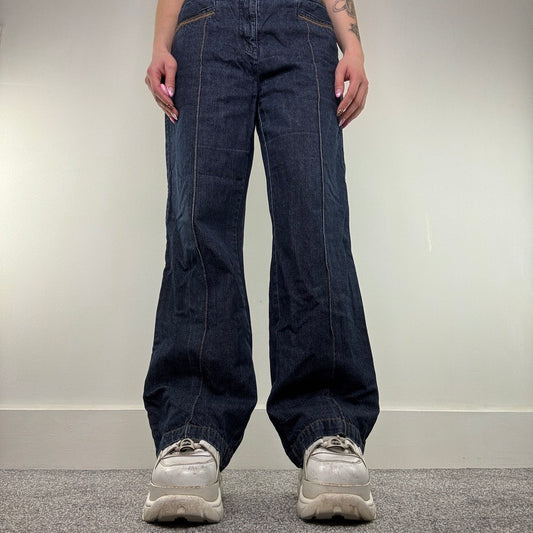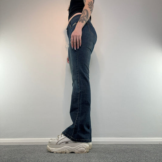 Y2K vintage baggy jeans flare faded denim mid rise dark denim wash