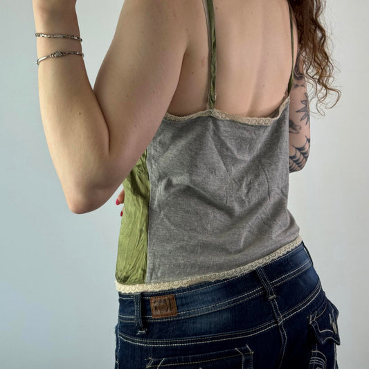 Y2K vintage silk lace trim cotton cami top strappy green cream grey