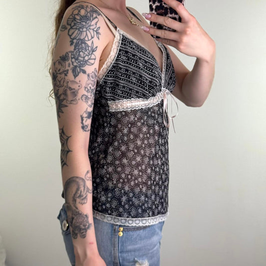 Y2K vintage sheer ditsy floral cami top lace trim black white baby pink strappy