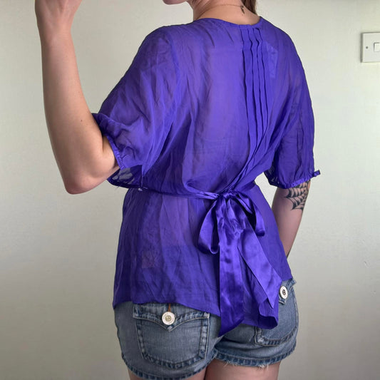 Y2K vintage silk flowy sheer blouse short sleeve v neck floral beaded tie bow