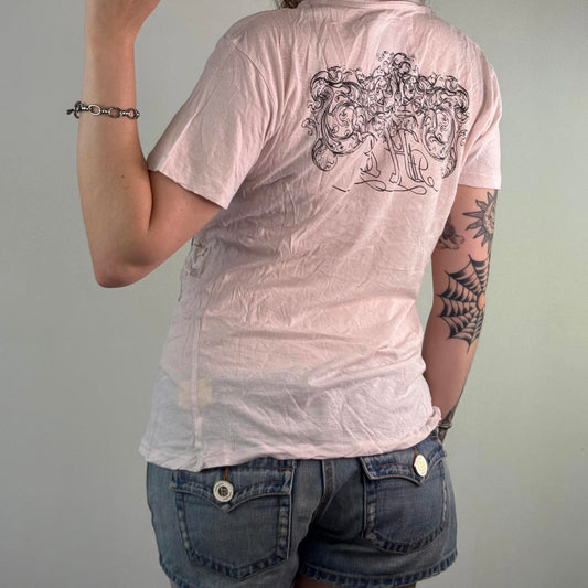 Y2K vintage sheer baby pink t shirt graphic print filigree text jesse pinkman