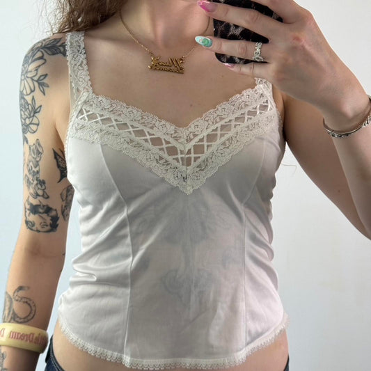 Y2K vintage sheer lingerie cami top v neck lace trim straps white small