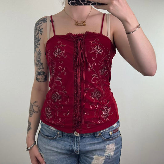 Y2K vintage sequin floral slinky cami top lace up bust strappy lace trim