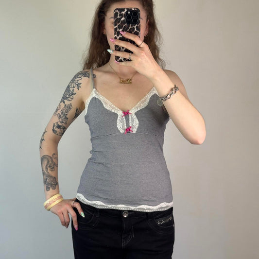 Y2K vintage stripe sparkly cami top lace trim pink bow bust navy white strappy