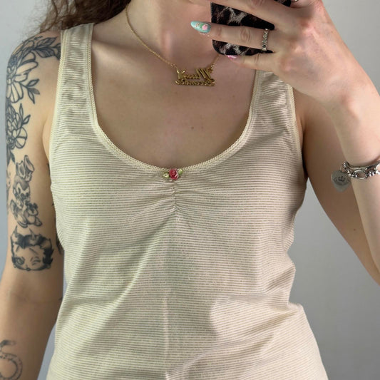 Y2K vintage stripe glitter v neck tank top lace trim 3D rose cream gold stretchy