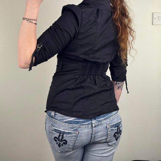 Vintage Jane Norman button up shirt 3/4 sleeve popper v neck fitted black buckle