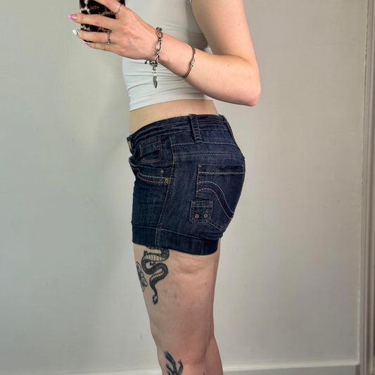 Vintage mid rise dark denim mini shorts contrast stitch turned up hem