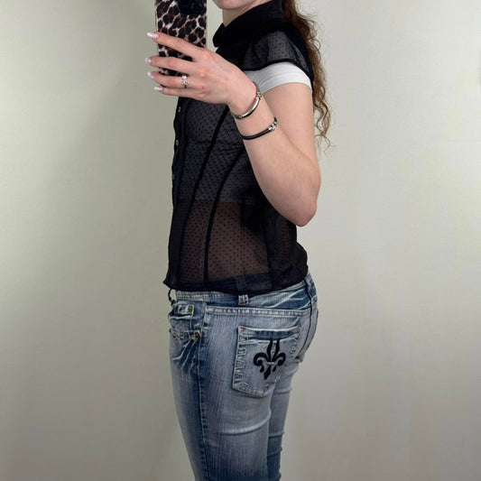 Vintage Karen Millen silk sheer short sleeve button up blouse polka dot puff cap