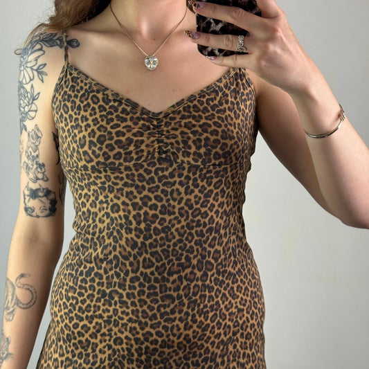 Y2K vintage thick mesh leopard print midi dress strappy v neck bust lightweight