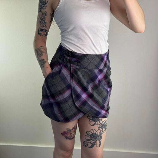 Y2K vintage Ted Baker wool mini skirt tartan buckle side pockets purple grey