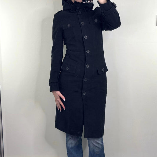 Y2K vintage trench coat button up with hood full length black fitted high neck