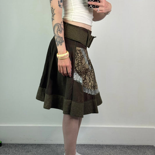 Y2K vintage tweed abstract print midi skirt built in belt khaki cream silver M
