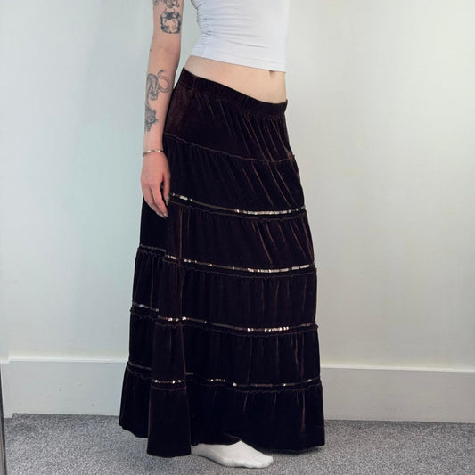 Y2K vintage velour sequin tiered maxi skirt brown a line stretchy boho