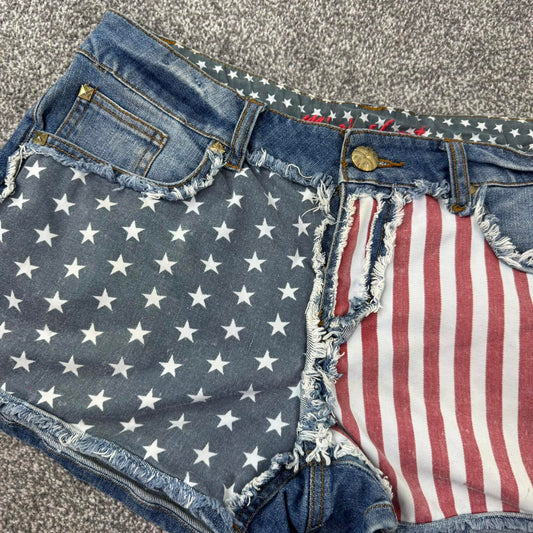 Y2K vintage USA flag low rise denim mini shorts distressed patchwork studded