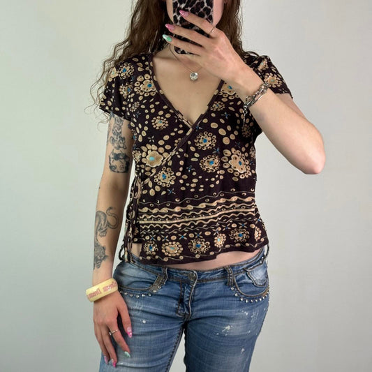 Y2K vintage wraparound v neck floral top short sleeve sequin bow beaded boho