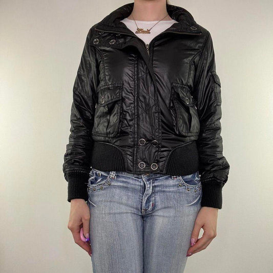 Y2K vintage zip up short puffer jacket popper buttons shiny elastic waistband