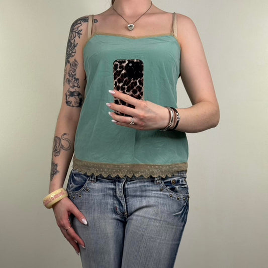 Zadig & Voltaire silk cami top turquoise blue khaki strappy mesh lace hem