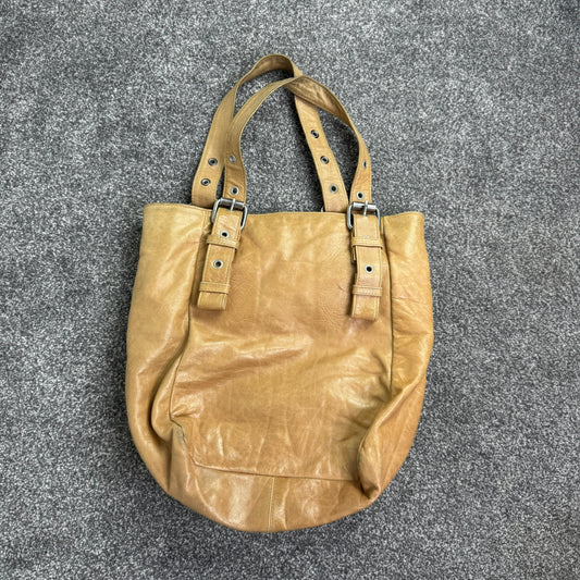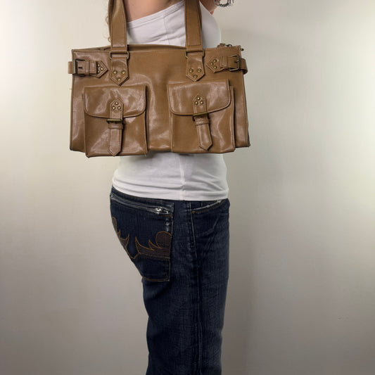 Y2K vintage leather shoulder bag buckle light brown large grommet work school