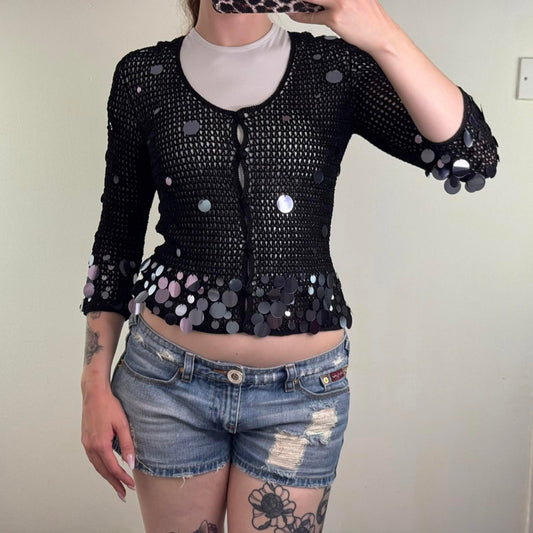 Y2K vintage crochet sequin embellished cardigan knit 3/4 sleeve scoop neck