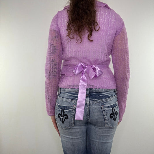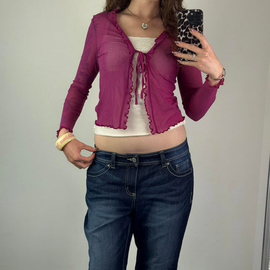 Y2K vintage Bay pink mesh long sleeve cardigan tie bow front lettuce hem cropped