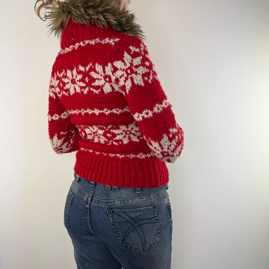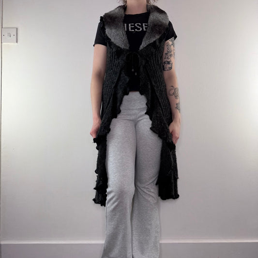 Y2K vintage afghan wool fur trim sleeveless cardigan cable knit fitted long