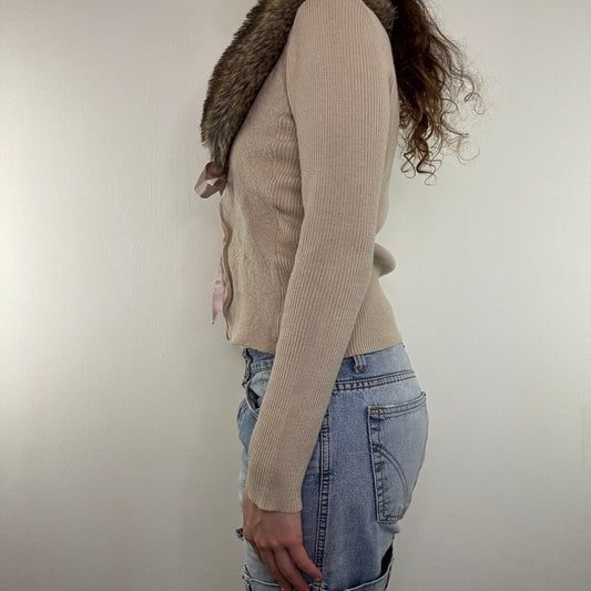 Y2K vintage beige bow faux fur trim cardigan