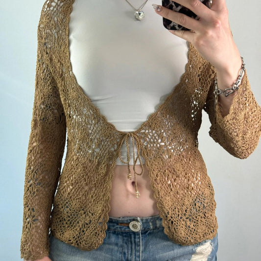 Y2K vintage crochet floral long sleeve cardigan boho tie bow front sheer summer