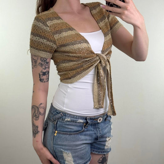 Y2K vintage Bay cropped tie bow front cardigan sparkly glitter stripe gold