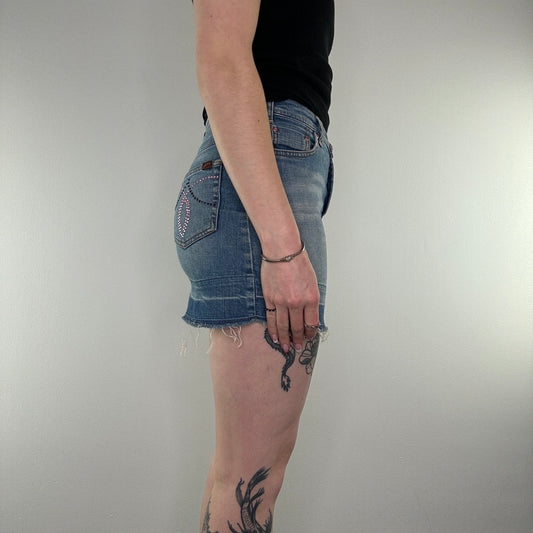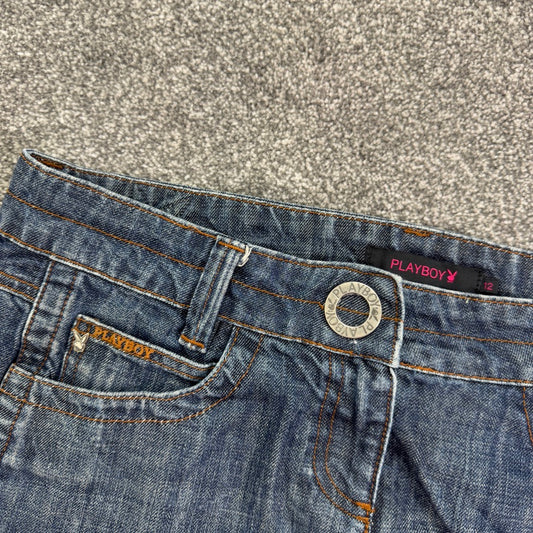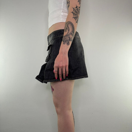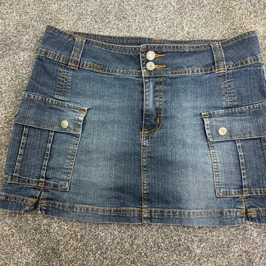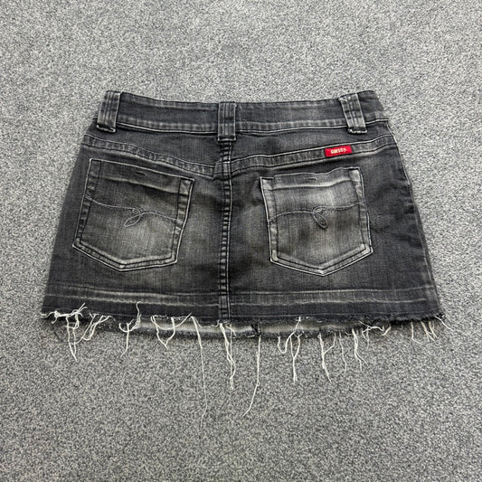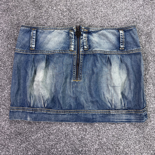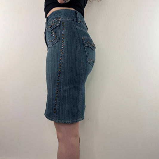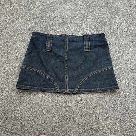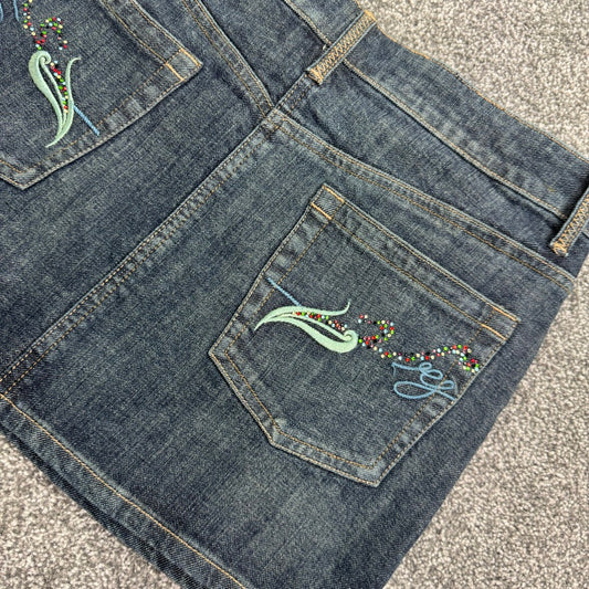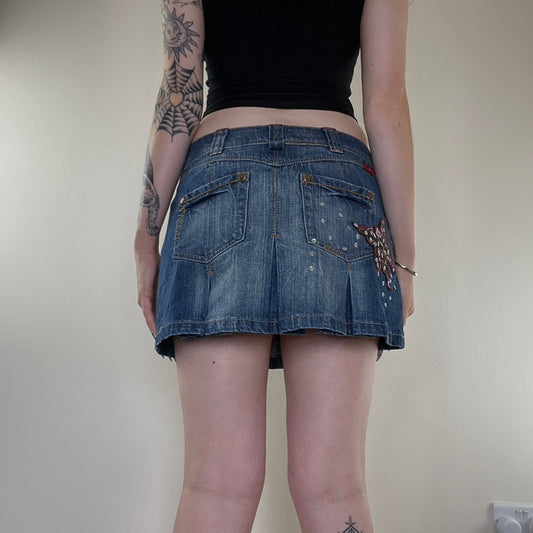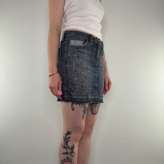 Y2K vintage denim mini skirt dark wash faded rhinestone mid rise